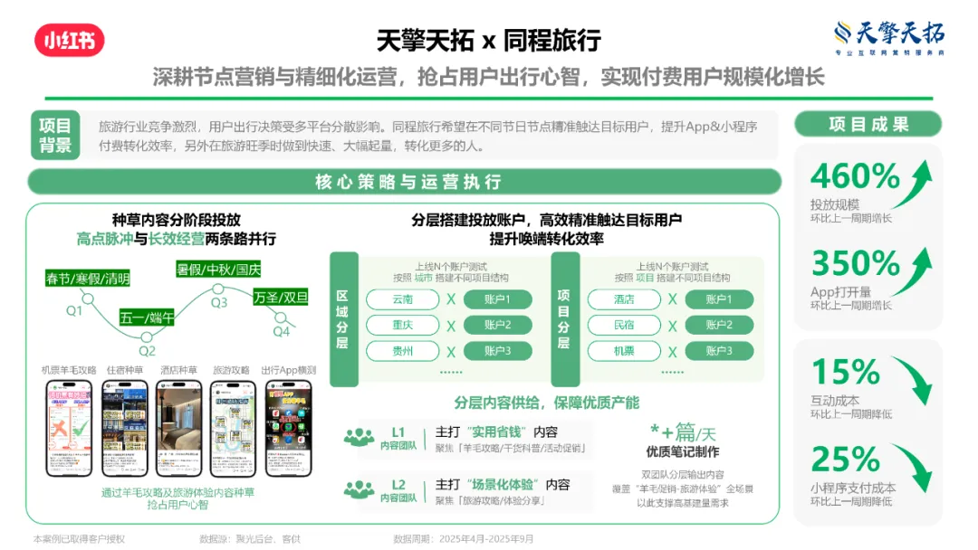 在互联网交易平台领域,为同程旅行量身定制节点营销与精细化运营方案,通过“羊毛攻略”与“旅游体验”内容分层种草,高效抢占用户出行心智。投放期间实现投放规模环比增长460%,App打开量提升350%,实现付费用户规模增长化。