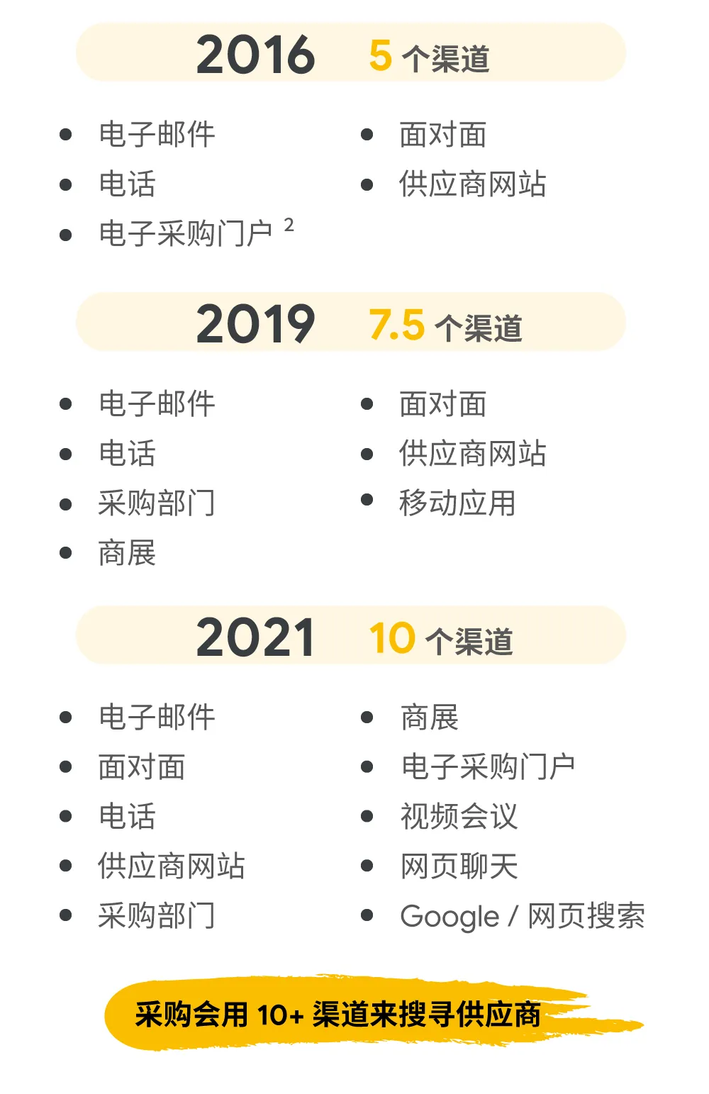 从2016年到 2021年,B2B 买家搜索供应商的渠道由5个发展成为超过 10 个,其中线上渠道的重要性越来越凸显。