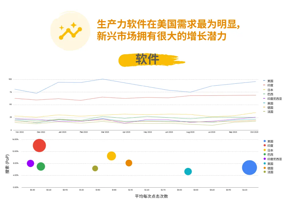 · 各类软件搜索指数都在增长,其中包括生产力软件。美国市场对生产力软件的需求最为明显,同时新兴市场(如印度市场)也有很好的机会并且广告投放成本更低。