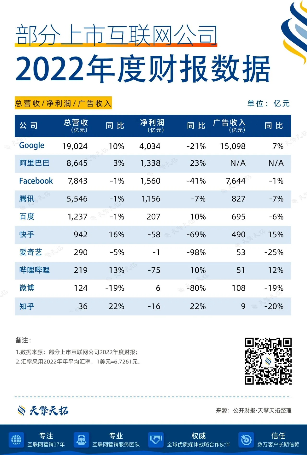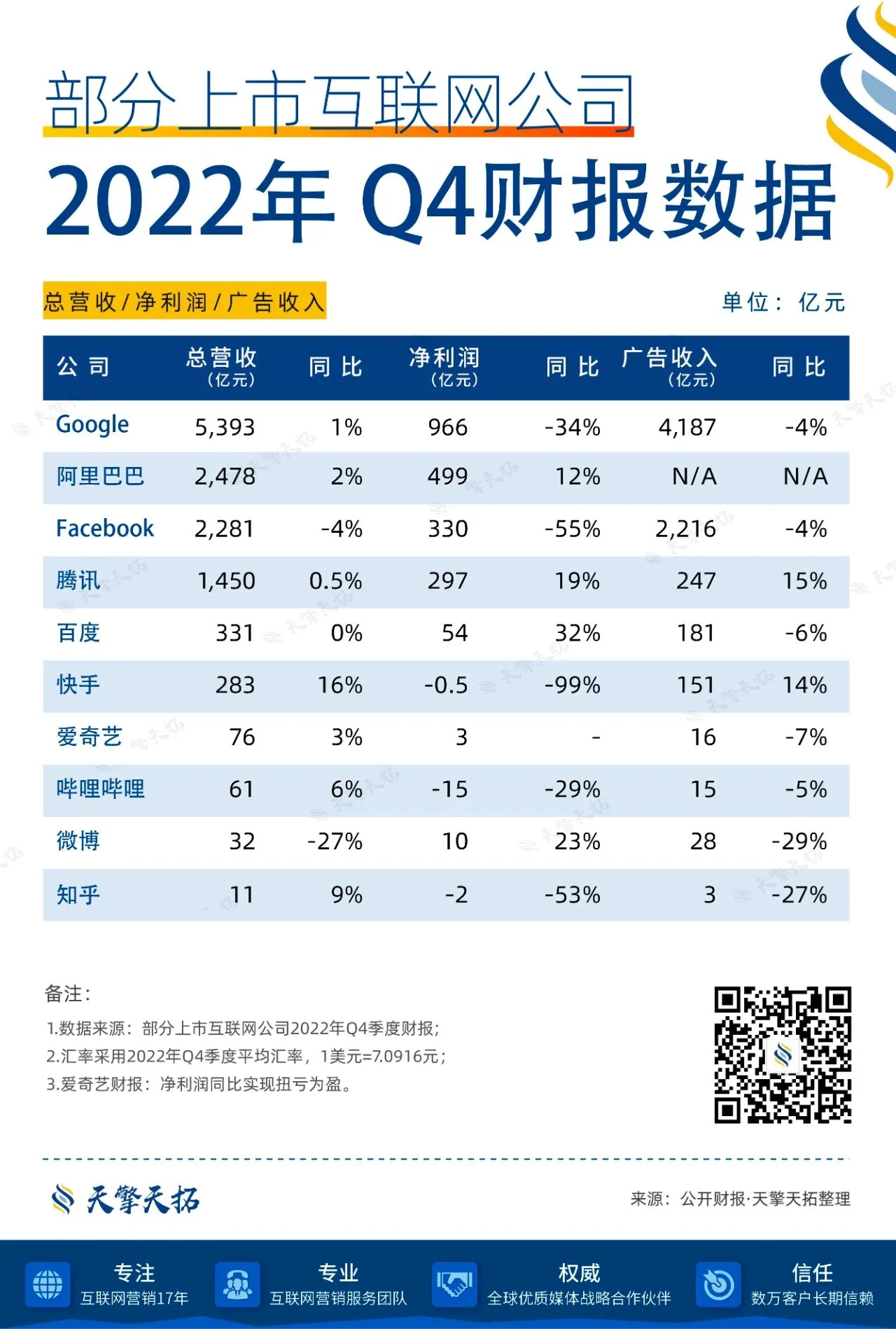 2023年Q1即将结束,各大上市互联网公司2022年Q4财报及全年财报数据已全部发布。天擎天拓整理了其中10家公司的2022年Q4季度财报、月活、日活数据及2022全年财报数据,供您参考。