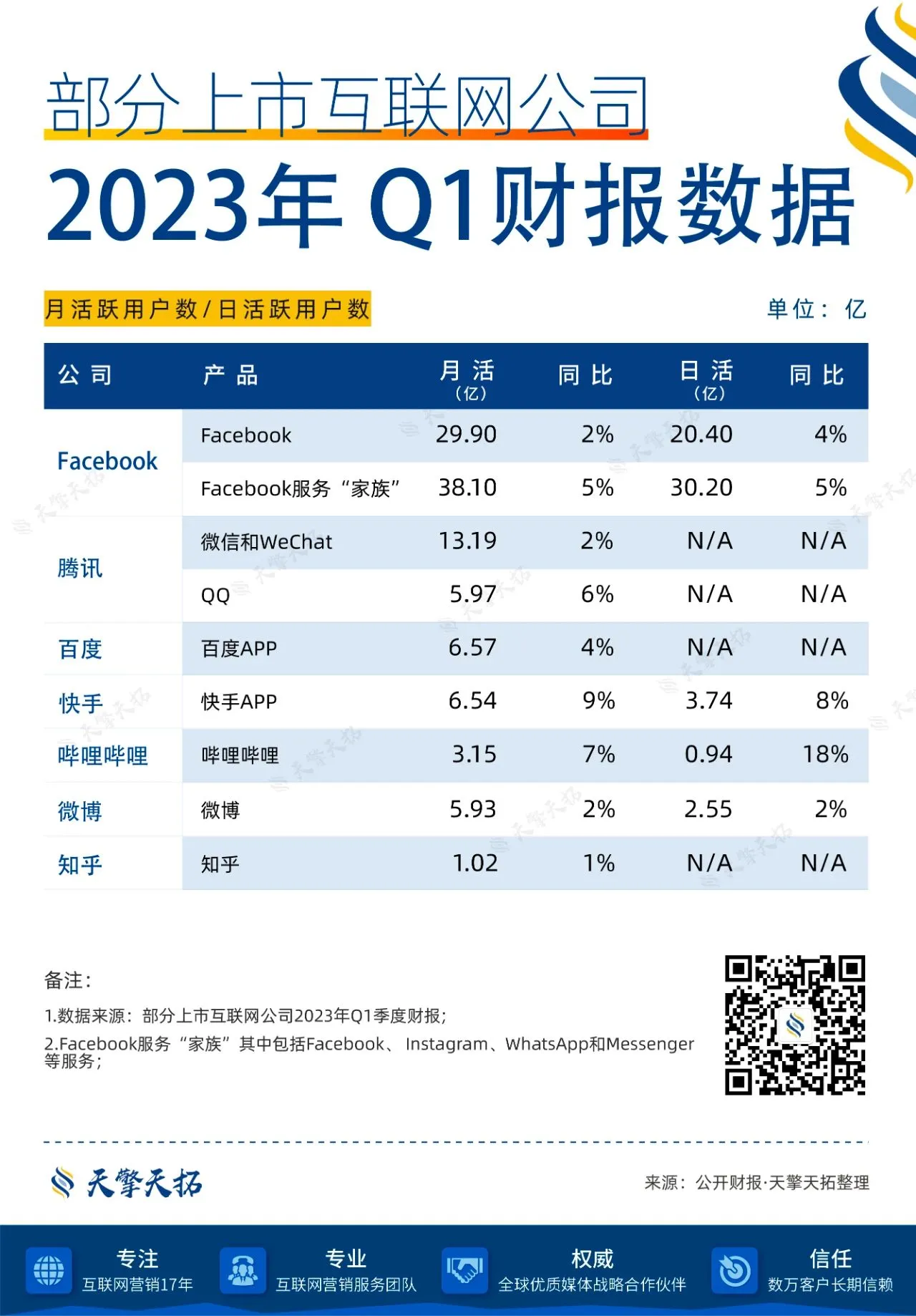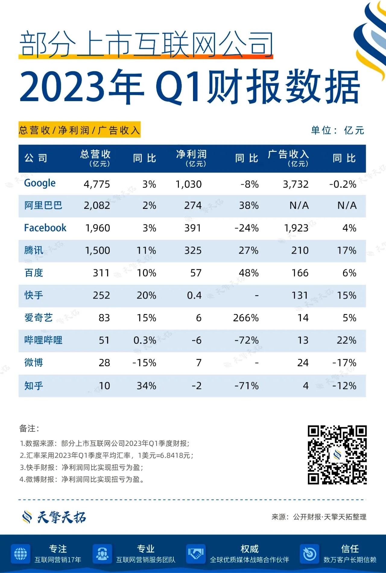 2023年Q2即将结束,各大上市互联网公司2023年Q1财报数据也已经全部揭晓,天擎天拓整理了其中10家公司的财报数据,供您参考。
