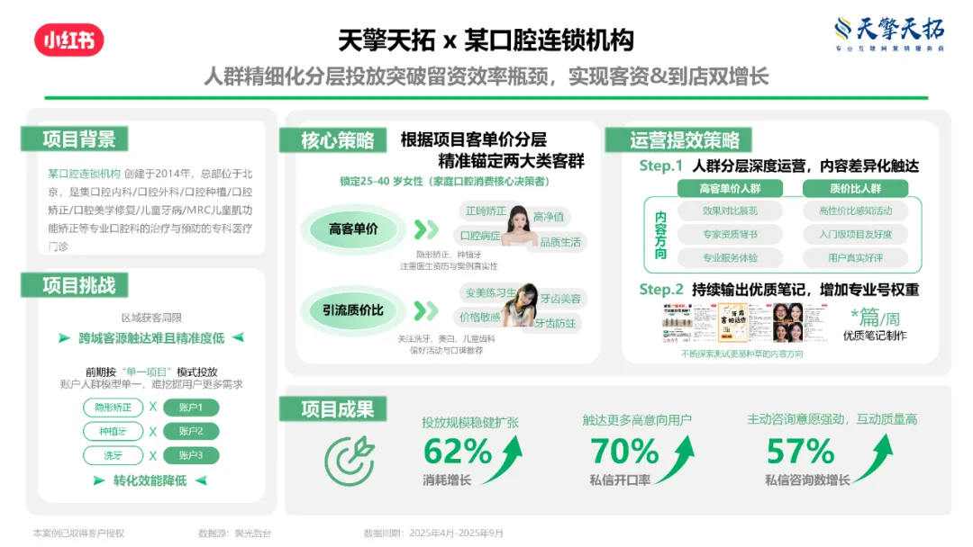 在医疗健康领域,为某知名口腔连锁机构定制精细化营销方案,通过人群分层与差异化内容策略,精准触达25-40岁女性家庭决策者,突破区域性获客瓶颈。项目实现消耗提升62%,同时私信开口率高达70%,客咨数增长57%,实现客资&到店双增长。