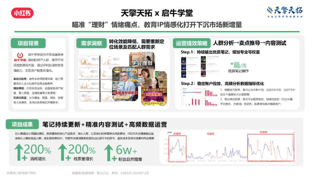 在教育培训领域,服务启牛学堂项目,通过精准洞察用户“理财”情绪痛点,以情感化内容打动下沉市场,配合精细化内容测试与数据运营,最终实现消耗与有效线索量双双增长200%,并带来超6万自然粉丝增量,成功开拓新的增长路径。