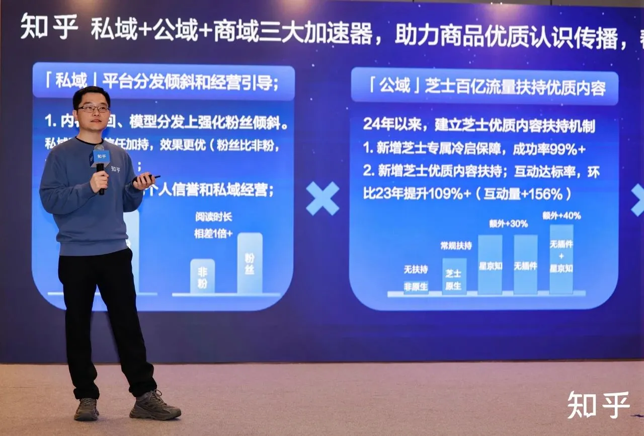 最后,知乎芝士产品负责人陈芝求对私域、公域和商城三大板块的升级进行了详尽阐述,介绍了以优质内容为支撑的扶持机制,旨在帮助品牌实现营销传播目标。知乎不再只是品牌曝光的入口,而将成为用户决策的核心枢纽。