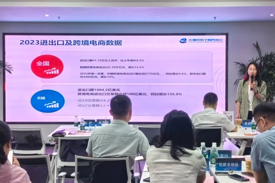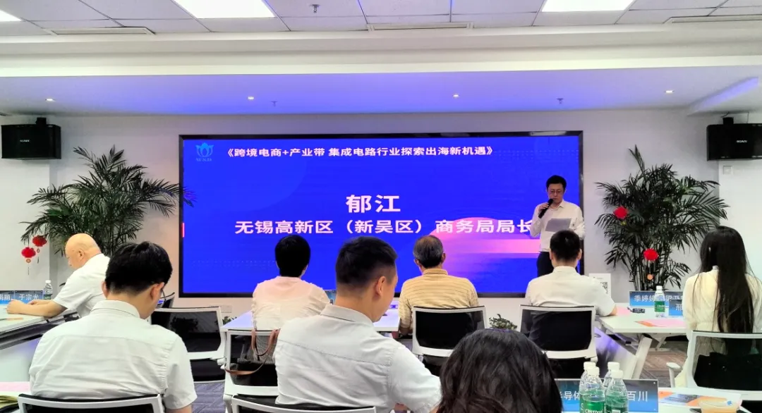 无锡市集成电路学会会长于宗光介绍了集成电路产业现状及发展趋势。无锡市电子商务协会秘书长梁乃霞分享了关于半导体集成电路出海市场的分析,并提出了协会在推动企业出海方面的支持措施。