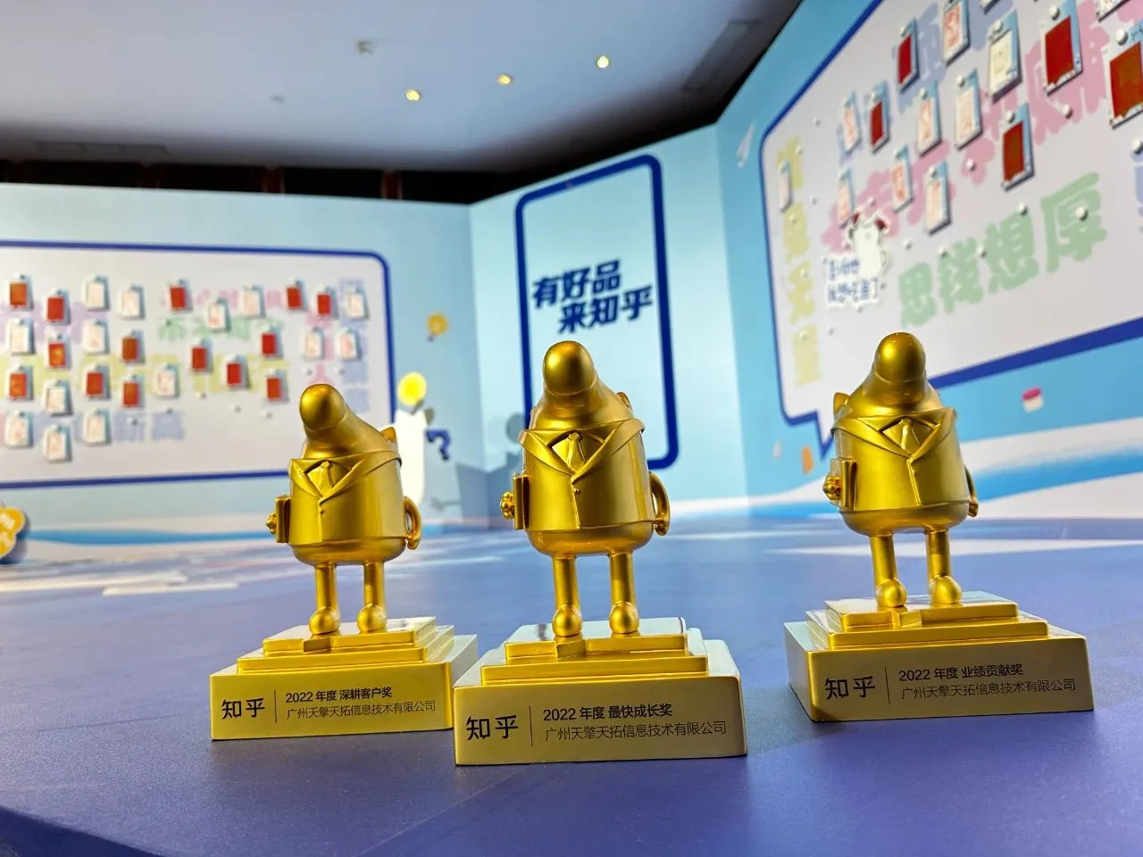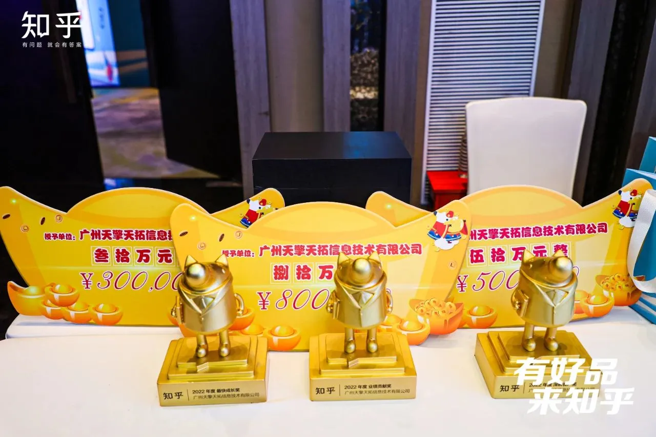 凭借在客户服务方面卓越的表现,天擎天拓荣获知乎2022年度「深耕客户奖」「最快成长奖」「业绩贡献奖」三项大奖。