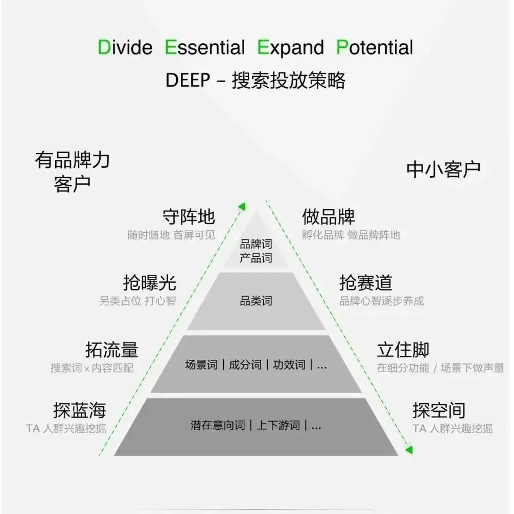 此外,在投放策略上,提出了DEEP搜索投放模型:Divide分词性+Essential锁核心+Expand抢赛道+Potential探蓝海,助力品牌在搜索中抢占心智,深度种草。