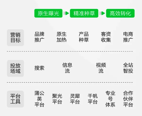在种草这一第三类营销范式的基础上,加上搜索、电商等构建起营销生态,同时结合小红书的「聚光」、「蒲公英」、「灵犀」等工具,洞察需求、传播内容、优化投放,助力品牌商家“小红书种草,全域转化”,从而提升经营效率,实现「品效合一」。