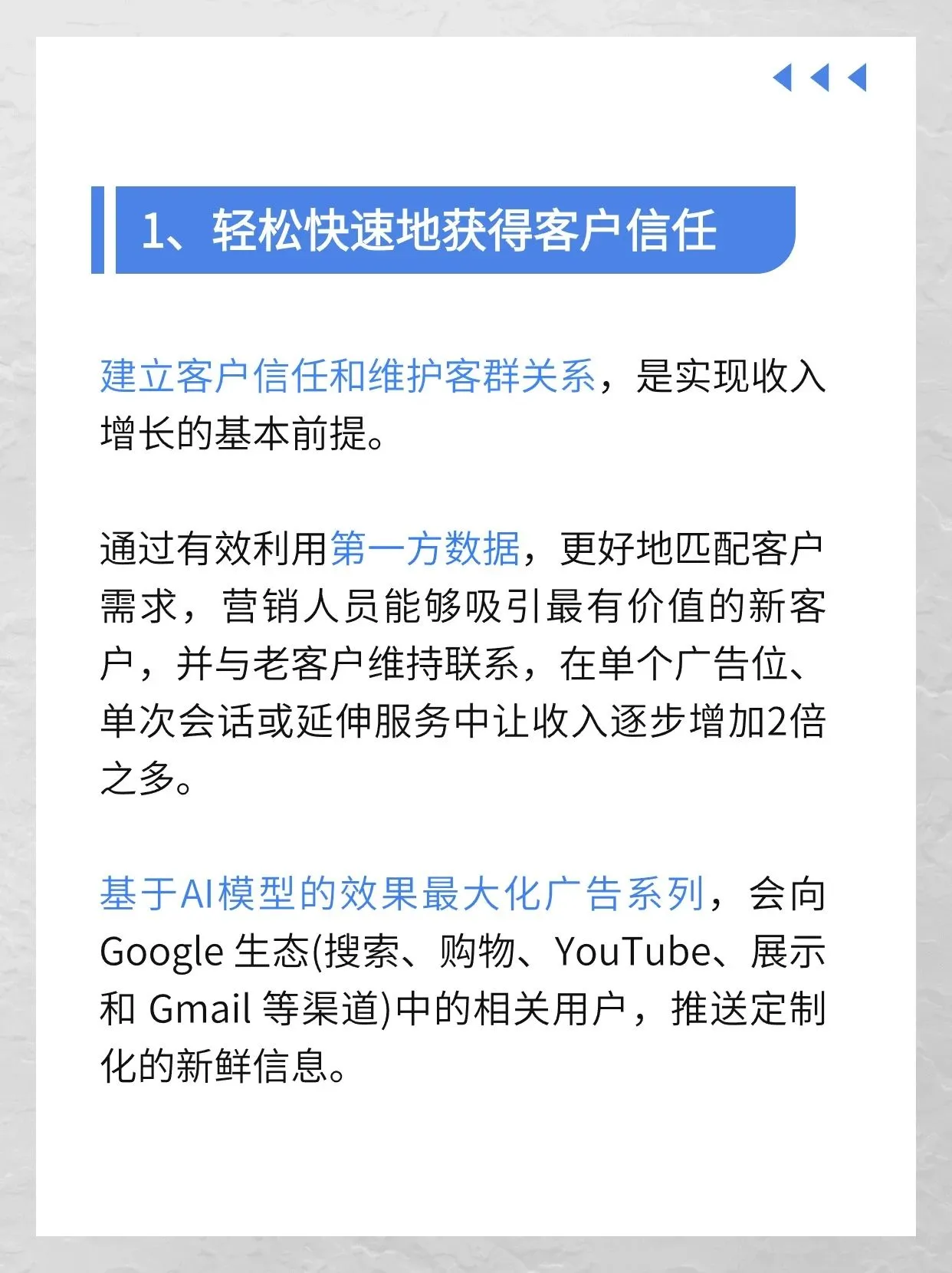 AI能够在消费场景中更敏锐地捕捉到营销的3W要素(What、When、How),在适当的时机为消费者推荐恰好满足其需求的产品。在 Google 每天数十亿次的主动搜索中,15%都是全新搜索。每天都有新产品被发现,产生新消费机会。