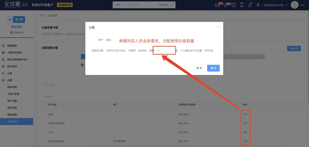 示例:可以灵活分配不同的操作权限与云盘容量,云盘文件一键同步。