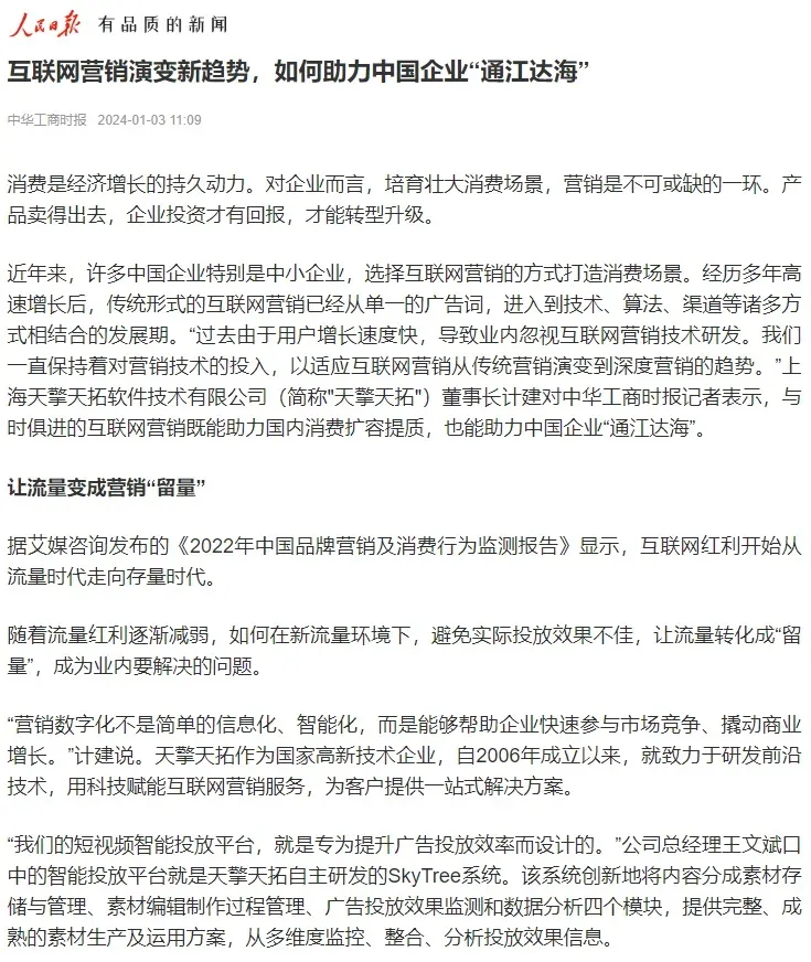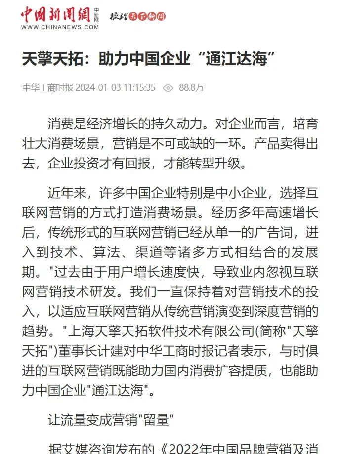 2024年1月3日,《中华工商时报》头版头条发表了文章《天擎天拓:助力中国企业“通江达海”》,聚焦天擎天拓及旗下产品全球赢的现状与发展,深入剖析了天擎天拓在出海营销领域的核心优势和发展策略。