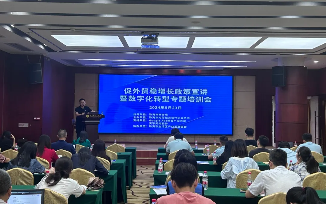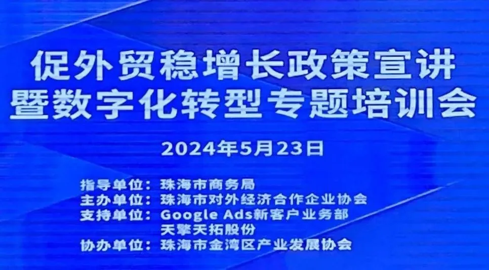 5月23日,在珠海市商务局的指导下,由珠海市对外经济合作协会主办、珠海市金湾区产业发展协会协办、天擎天拓股份和Google Ads新客户业务部支持的促外贸稳增长政策宣讲暨数字化转型专题培训会在珠海成功举办。