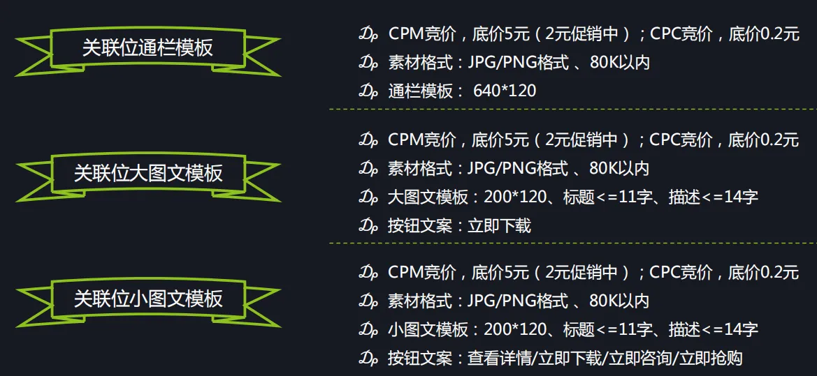 a.图片:JPG或PNG静态图片,图片大小≤80K,尺寸:600*300广告文案,不大于30个字显示在广告位大图左上方;