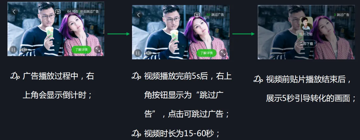 广告展现位置:视频播放完前5s以后会出现广告,右上角按钮显示为“跳过广告”,我们点击可跳过广告。
