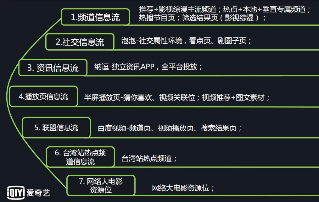 信息流广告包括频道信息流(推荐+影视综漫+筛选结果页、热点+地方+垂直、热播节目页)、社交信息流-泡泡、资讯信息流-纳逗、播放页信息流(猜你喜欢、视频关联位)、联盟产品-百度、台湾站热点频道信、网络大电影资源位。