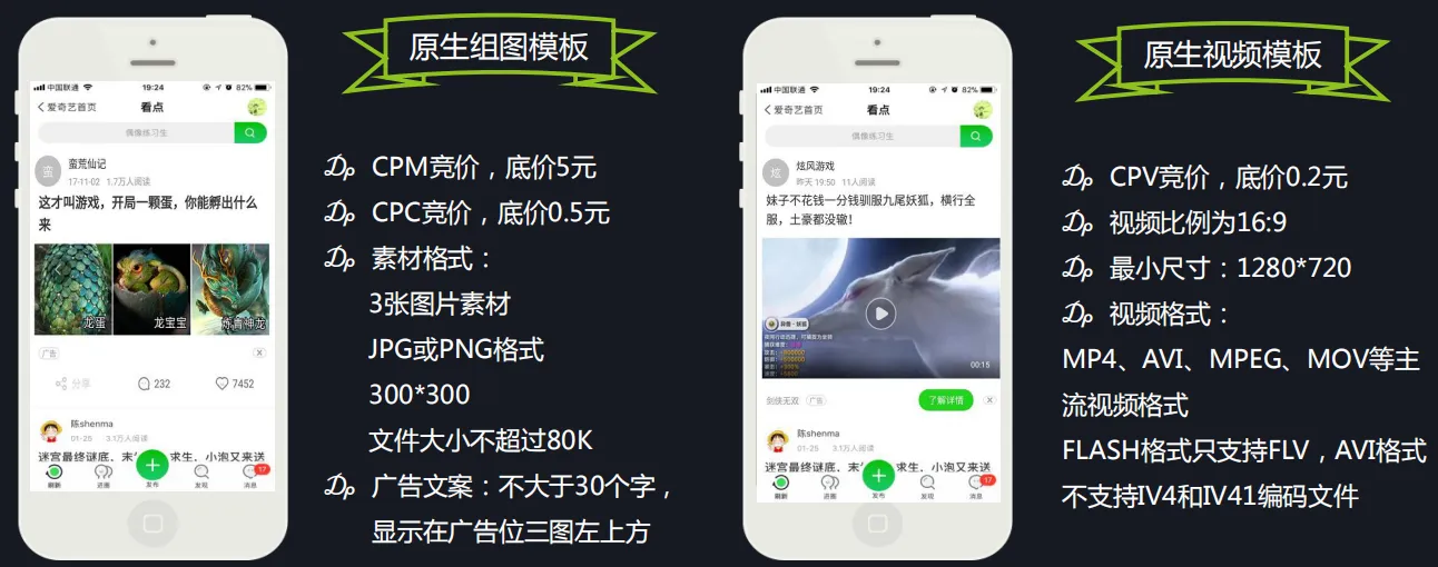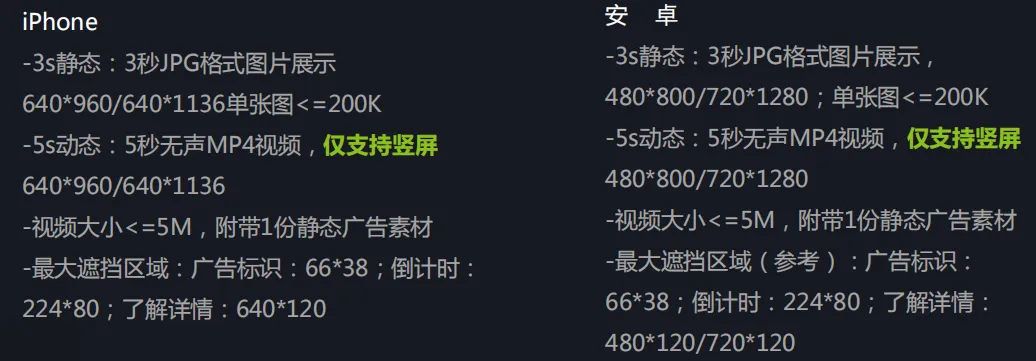 爱奇艺广告创意素材要求分iPhone和安卓两种,具体数据可以看下图: