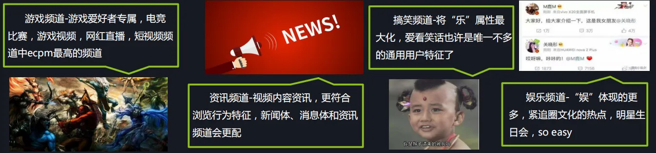 垂直频道:覆盖包含娱乐、原创、资讯、搞笑、游戏、财经、母婴等30+;