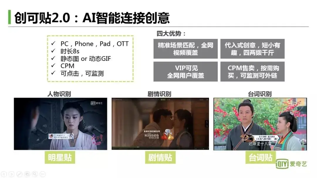 1.创可贴2.0是跟着指定的场景出现的广告,能实现精准的场景匹配,并且能覆盖到爱奇艺全网视频;