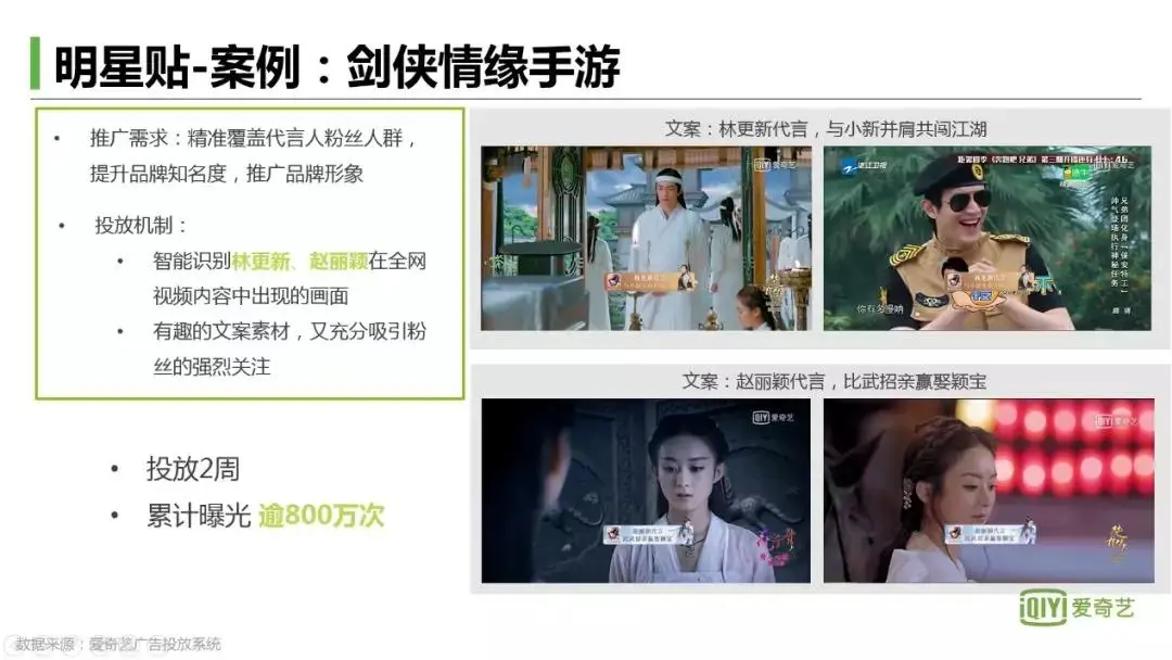 在全网视频中定向林更新和赵丽颖出现的所有场景,跟随展示广告。在林更新出现时,“林更新代言,与小新并肩共闯江湖”为文案的广告展现出来;在赵丽颖出现场景,又以“赵丽颖代言,比武招亲赢娶颖宝”的广告词来吸引粉丝,其中不仅覆盖到了代言人出演的热门剧目,还有综艺节目等内容。