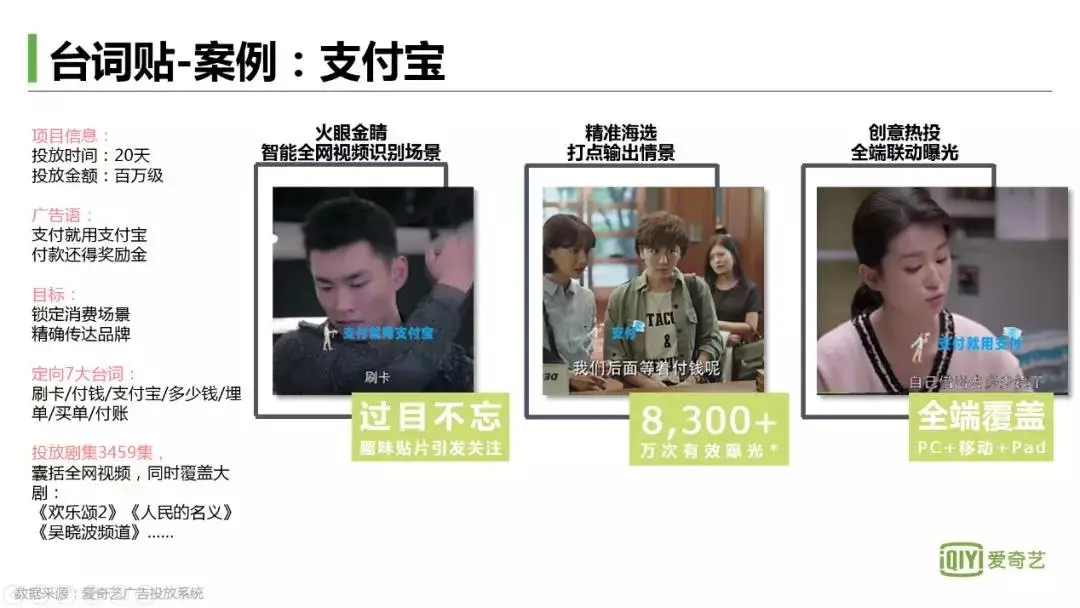 为了精准定向全网所有视频中的支付或相关的场景,支付宝选择了投放台词贴。
