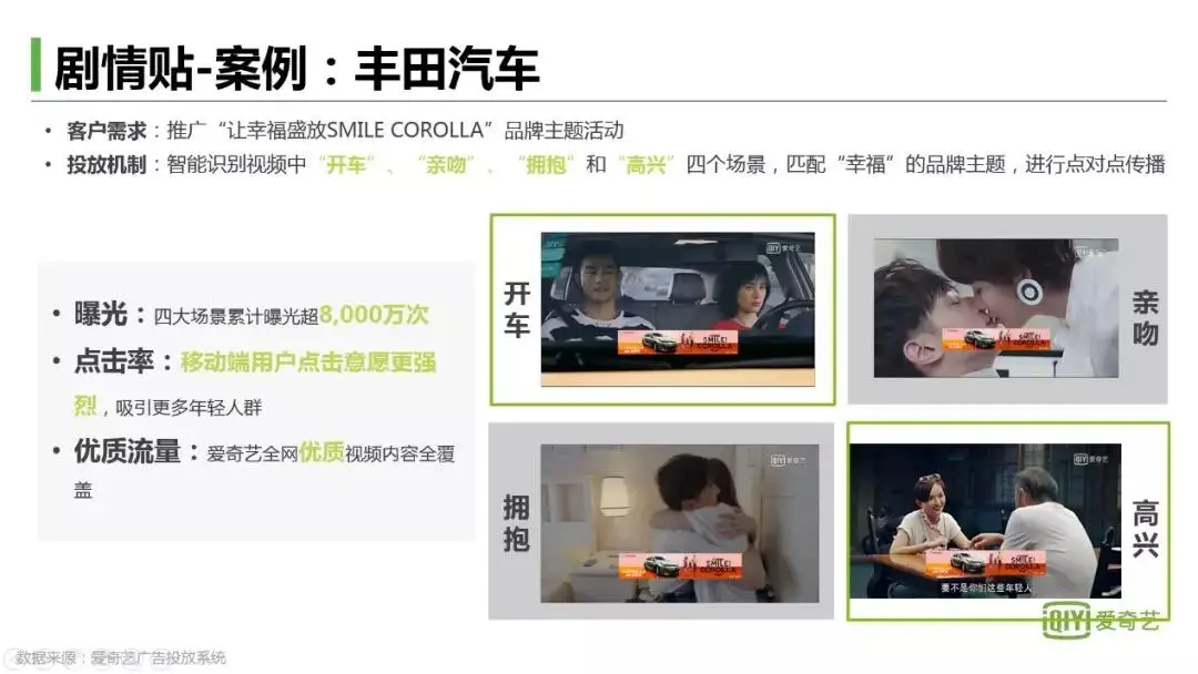 定向“开车、亲吻、拥抱、高兴”四个场景,匹配“幸福”的品牌主题进行点对点的精准投放,让受众在心中建立起开车时或者开心时与卡罗拉的正向联系。
