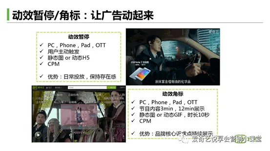 广告展示位置:在用户实际观影过程中,在暂停或播放状态下的框内广告,分别是暂停和角标广告。均都支持静态图素材或者动态素材,实现“让广告动起来”。