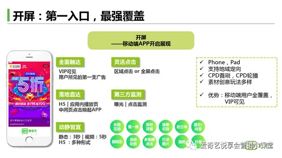 使用场景:如广告主看重爱奇艺VIP人群,需要大尺寸的广告展示来宣传新品或活动,需要具有冲击力的展现形式来保持品牌格调,推荐投放开屏广告。