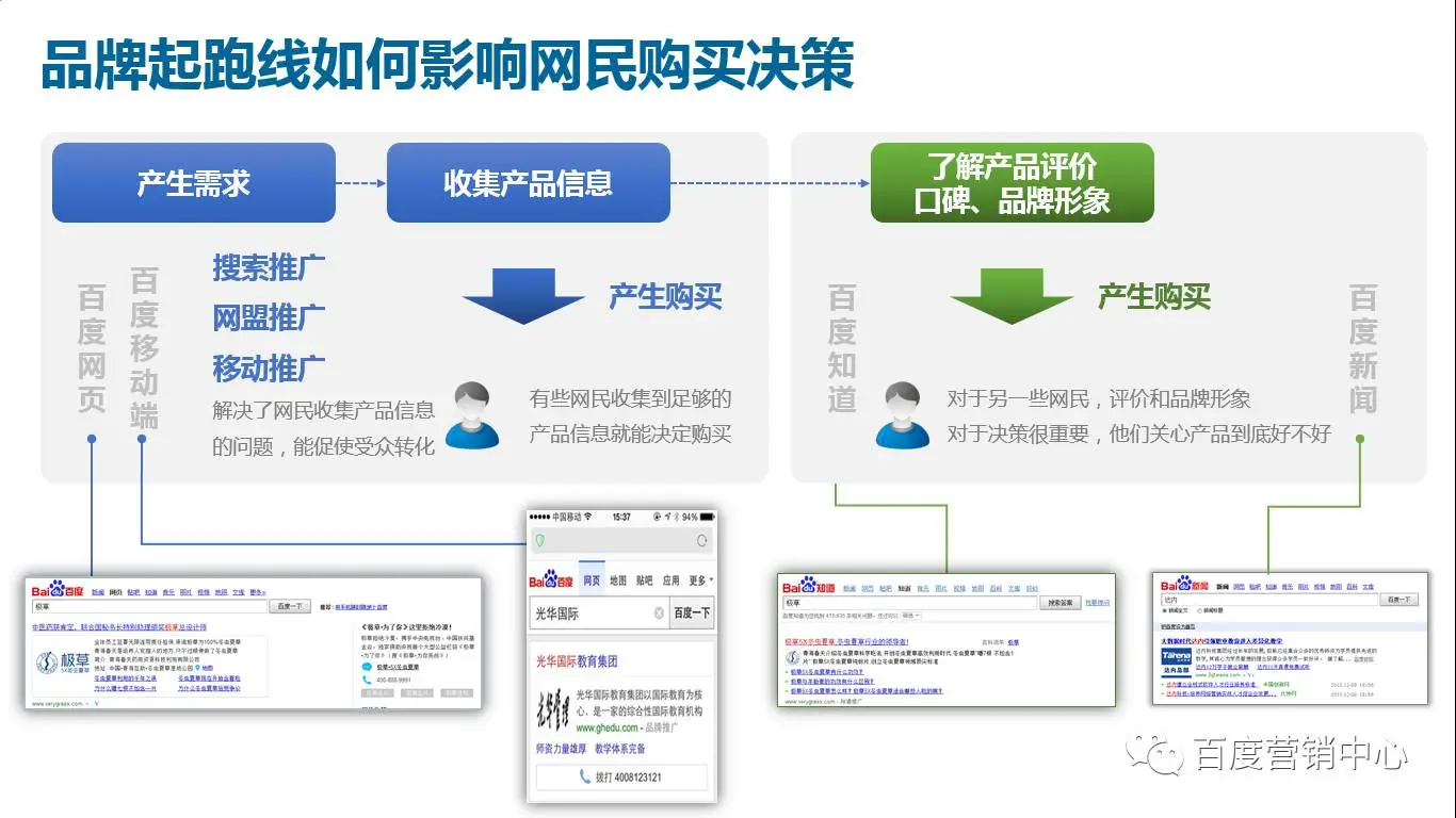 用户搜索家政服务,通过对几个品牌的分析比较,最终选定一个品。用户初识一个品牌是通过华表,了解是通过品专或者品跑,最后信任这个品牌可以通过知识营销帮助他建立。