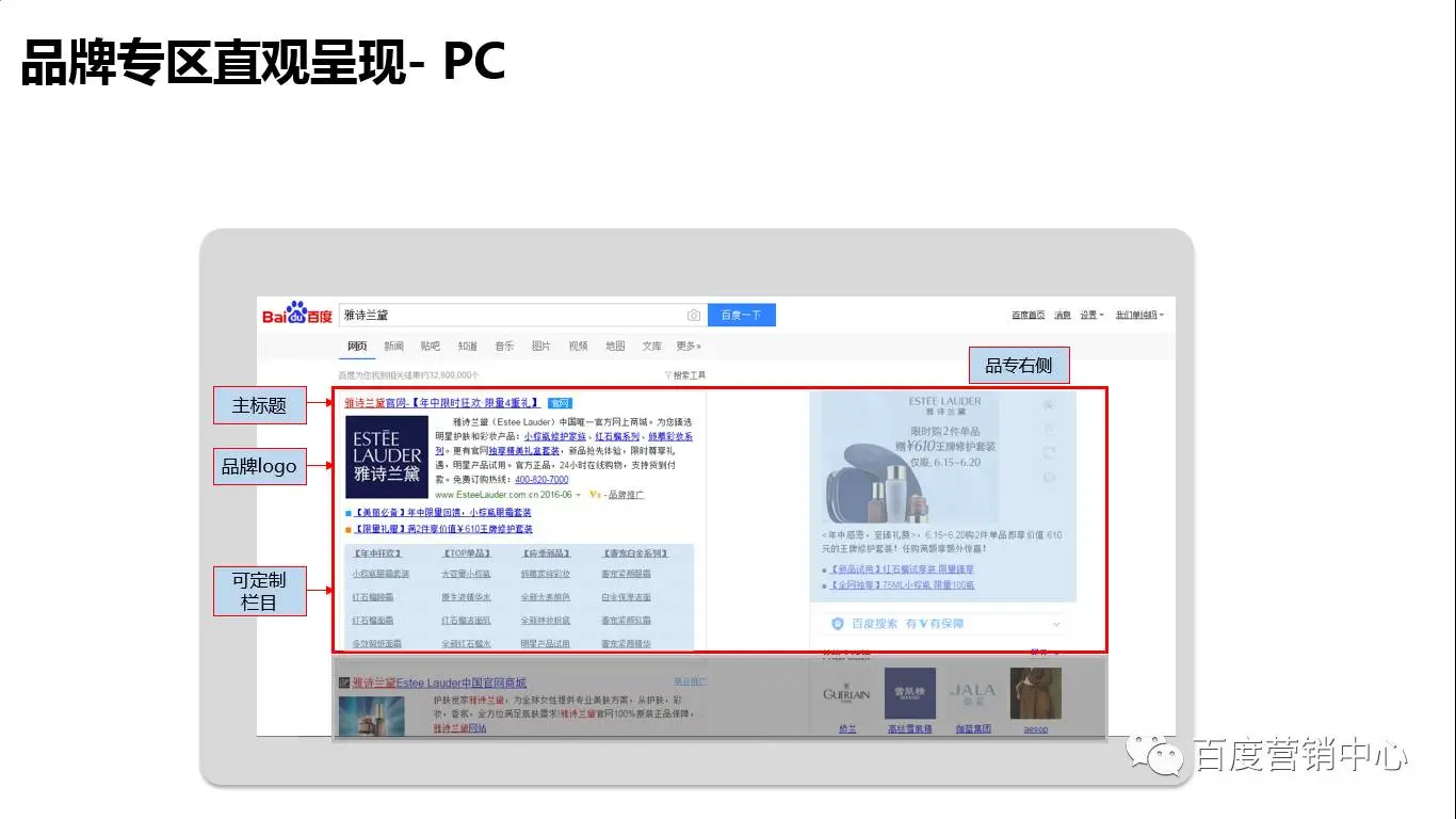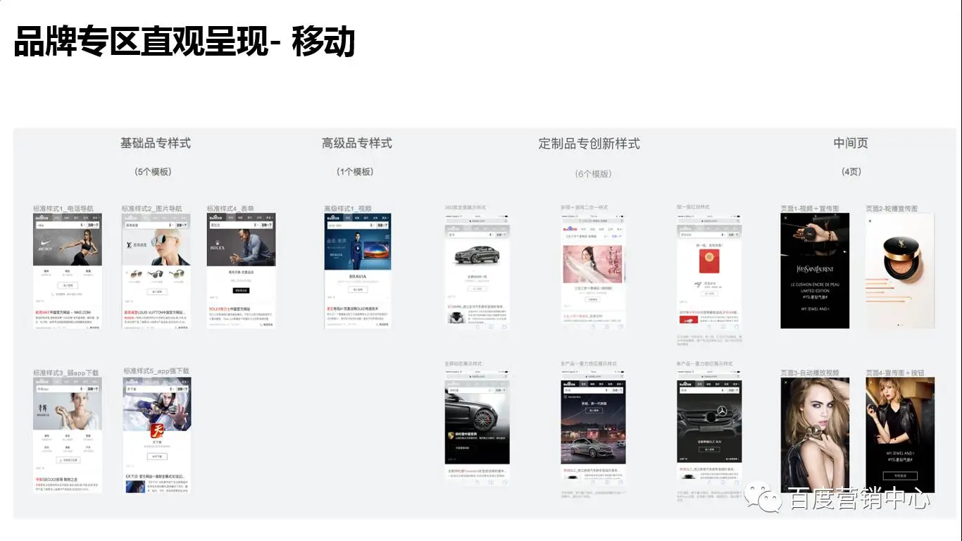 首先介绍一下品牌专区,上面两幅图是品专的广告展现形式,首屏首位展现。第一幅是PC端样式,PC端样式种类很多,上图是一个基础品牌样式,对于品牌的呈现效果很强。第二幅是移动端样式。