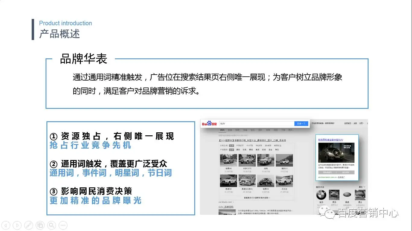 品牌华表在你的品牌还没有建立的时候,帮你的品牌进行导流。那么用户如何知道一个品牌?有一部分用户是通过检索需求词,比如用户搜一个十万的SUV,他的需求明确,搜索之后呈现的所有结果和信息对他来说都非常重要,可以帮助他来决策的。品牌华表通过右侧的位置展现出来一个广告,算是整个搜索页面最大的图片,用户第一眼就会看到这个品牌。那么用户会看吗?会,因为客户的需求是一个10万元的SUV。但是用户看了就会买吗?不一定。生活服务也一样,对于决策成本高的产品也会有一个选择的过程。比如一个婚纱摄影的品牌,客户买品牌词的同时还应该尽可能的覆盖潜在的需求,即一些通用需求词,华表是可以覆盖这些词的。