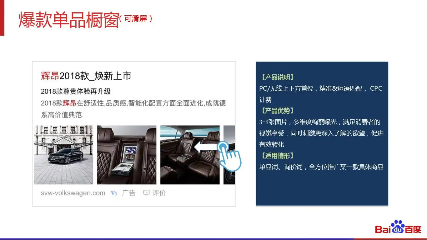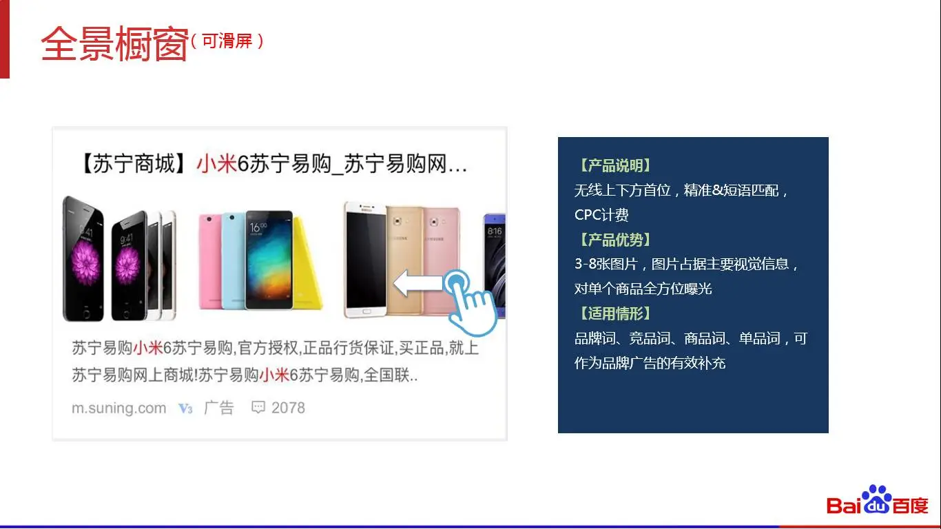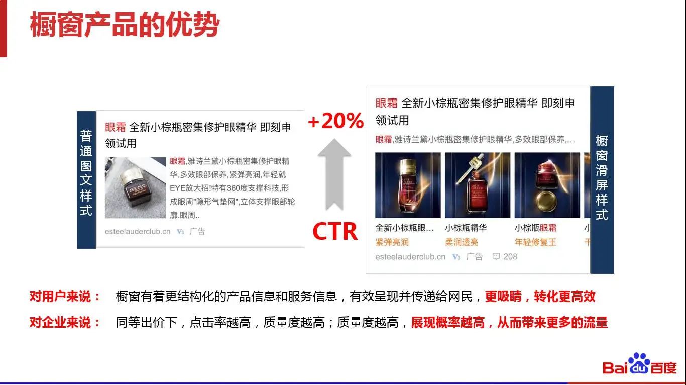 新的橱窗系列拥有更大图片,相比原有图片增大1/3;增加了炫酷的滑屏效果,当图片超过3张时,自动开启滑屏功能;无线首位强势呈现,将大幅提升企业的商品广告效果;根据前期实验数据,开启滑屏后,相比静态版橱窗样式,平均点击率提升20%以上。