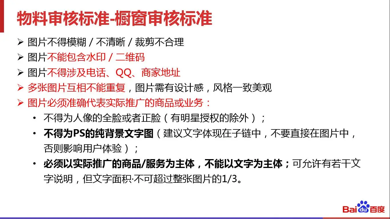 通过前面样式介绍,不难发现,橱窗系列是图片强样式的曝光。所以对于图片也有着比较严格审核,这当中包括机器审核和人工的复审。接下来我们一起了解下审核规则,帮助我们能够快速的广告上线。