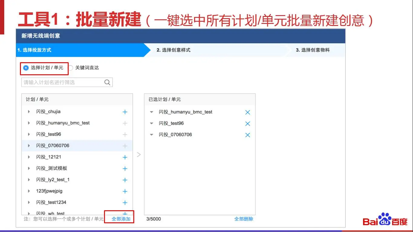 新建无线/计算机端创意,勾选计划时,可以选择全部添加,为计划批量增加。