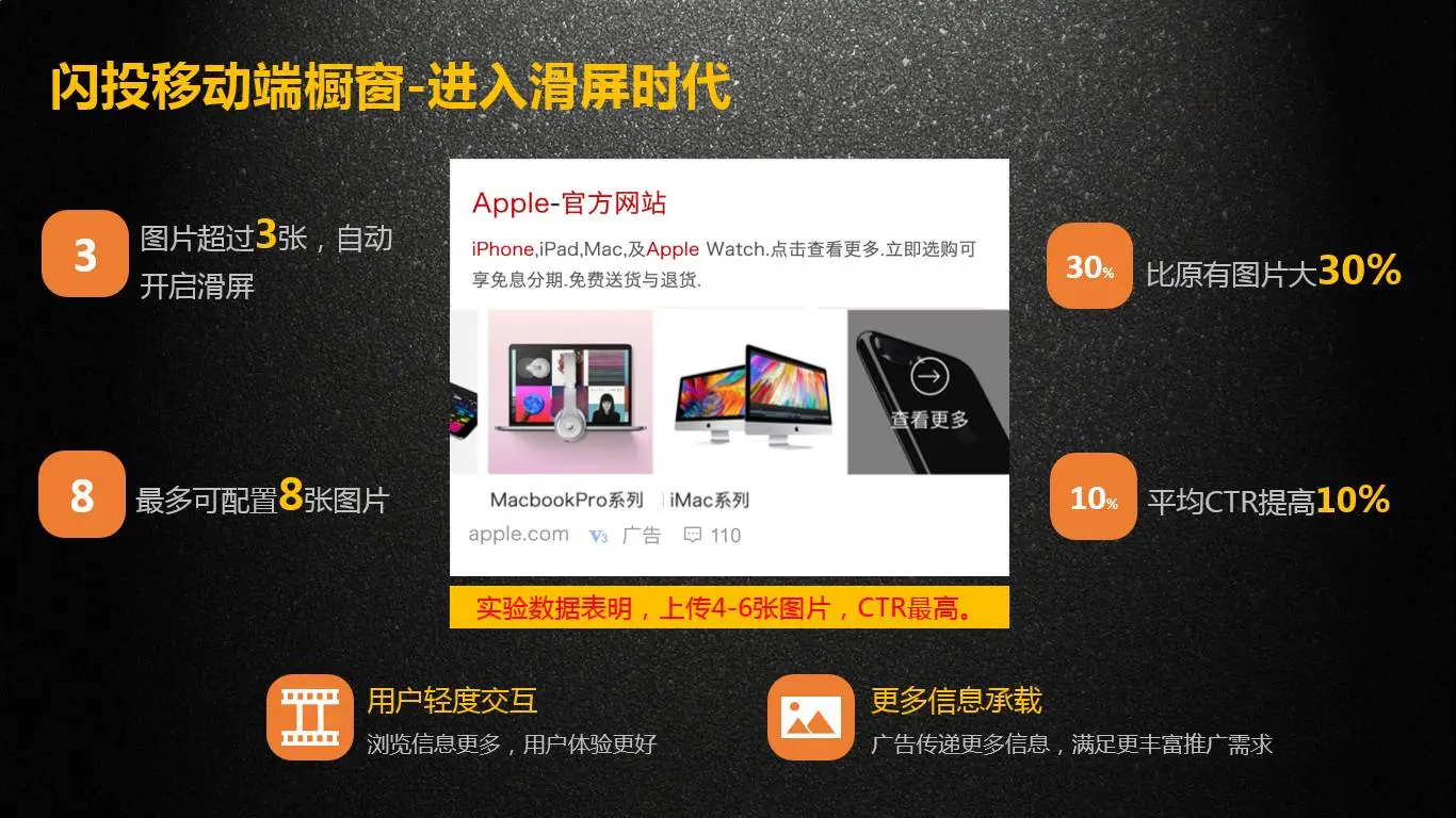 手机和电脑浏览信息产品有很大的不同,手机的屏幕相对更小,对于企业来讲,能够展示在消费面前的信息会减少,通过手机的触屏滑屏功能,使我们在广告体验上增加与消费者的互动,也传递更多的广告信息。物料超过3张图片,默认开启滑屏功能。物料等于3张图片,默认关闭滑屏功能。最多可以配置8张图片,我们测试结果4-6张的ctr最高。