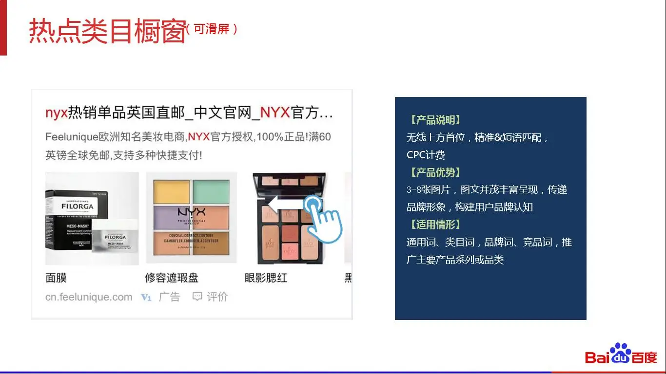 热点类目橱窗适合消费者在熟悉收集信息阶段影响他们。“热点类目橱窗”,图文并茂,在图片下方增加类别表述,适用通用词、类目词,品牌词、竞品词,推广主要产品系列或品类。比如消费者在搜索品牌词,或者行业通用词时,我们这个案例中,消费在搜索NYX这个彩妆品牌时,可能是对这个品牌感兴趣,通过朋友了解,口碑不错,特别是上色堪比大牌的开架产品,所以想了解,有没有好看的颜色适合自己的彩妆,此时,我们就适合展现品牌下多种类型的产品,吸引消费者进一步浏览。