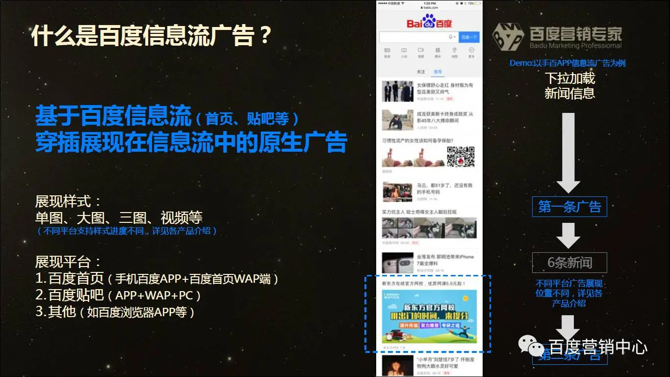 百度信息流广告就是穿插在百度首页,百度贴吧,还有百度浏览器的信息流当中的原生广告,这些广告以单图、大图、三图、视频等形式出现。