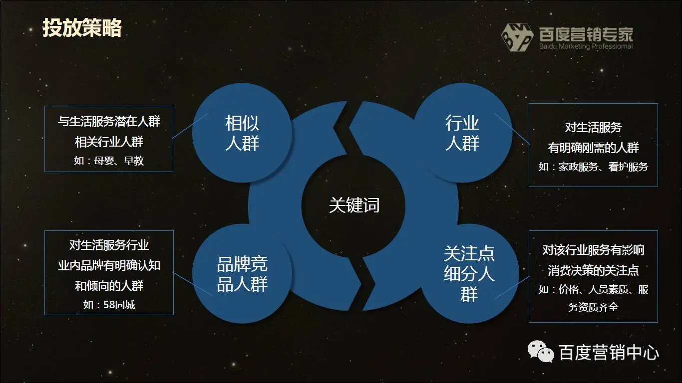 目标人群可以更快的帮助商家实现效果。目标人群包括行业人群和关注点细分人群。前者指搜索类似家政服务、看护服务等关键词并且没有做出决策的用户人群,针对在这类人群,百度会在其浏览信息流时推送相关信息。后者指在大搜时没有做出决定,并对类似价格、人员素质等影响消费决策的因素比较关注的人群,百度会推送相关内容以加深印象。