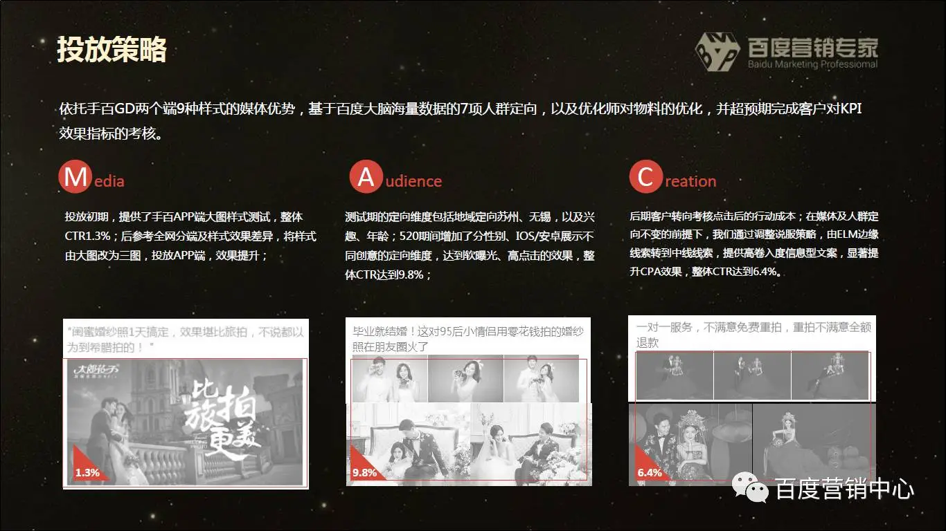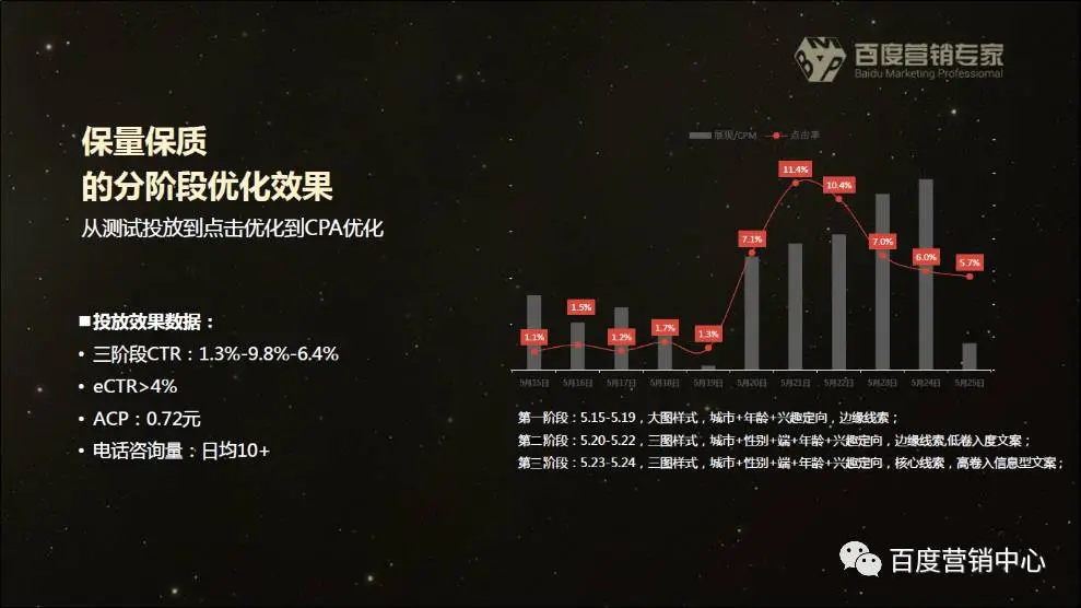 百度信息流投放分三阶段优化投放效果。第一阶段,使用大图样式,城市+年龄+兴趣的定向方式,但是点击率只有1.3%,并不高。第二阶段,参考全网分端及样式效果差异后,将样式改为三图,增加性别和分端需求定向,在边缘线索的基础上又提供了低卷入度文案,效果良好,在520期间达到了9.8%的点击率。第三阶段,客户的关注点落到点击后的行动成本,百度信息流在媒体和人群定向不变的前提下,调整说服策略,由ELM边缘线索转到中线线索,提供高卷入度信息型文案,显著提升CPA效果,获得了10%的电话咨询量,并且CPR达到6.4%。
