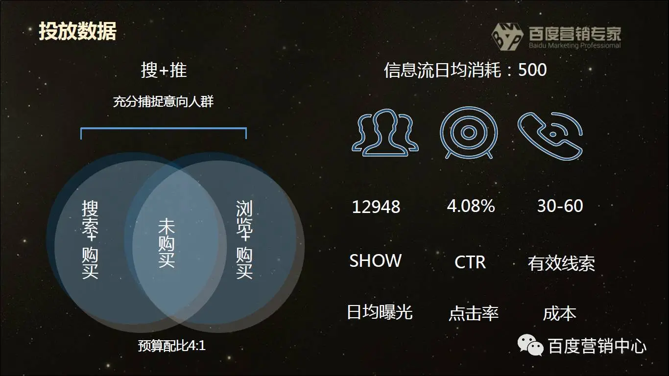 上图是无忧保姆网使用信息流产品后的效果分析,无忧保姆网采用推加搜的方式投放数据,即直接刨除搜索时已进行购买行为的人群,通过这样的方式,网站日均曝光达到12948,点击率达到了4%以上。