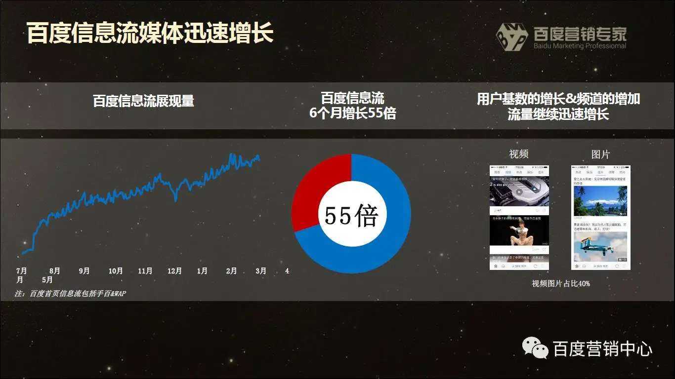 百度在去年六月开通信息流产品,基于百度已有的庞大用户基数,即活跃于手机百度,移动端搜索,WEB搜索等的7亿用户,从开通产品到现在,流量增长速度和用户增长速度都非常迅猛,六个月的时间就达到了55倍的流量增长。