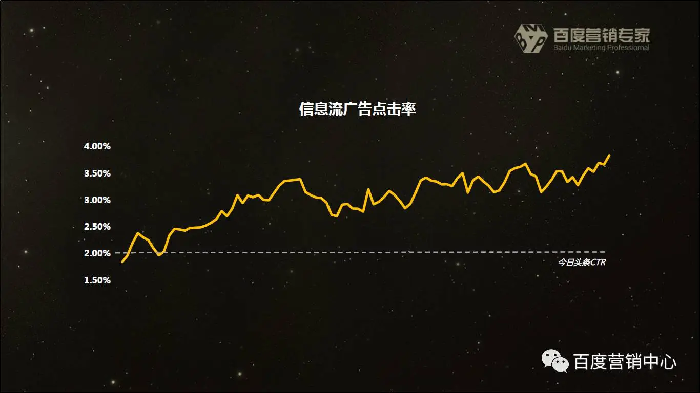 上图是百度与竞对的信息流广告点击率的对比。竞对的平均值在2%左右,而百度从去年上线时的1.5%增长到了目前的4%,上升速度非常快。
