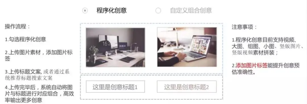 程序化创意优选历史优质图片、标题进行测试,对于新客户,广告创意要明确核心卖点;对于老客户,广告创意要提升计划成功率,以达成优质的转化率。