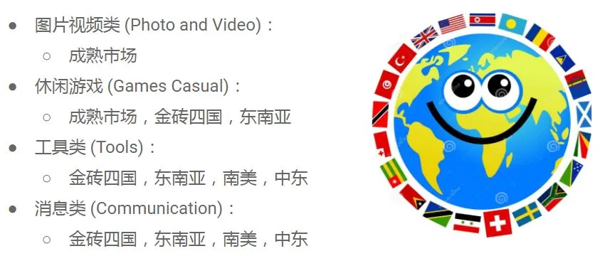 下面这张图,总结了目前不同类别的App对应的最为热门的区域市场,例如手游,热门市场就是成熟市场(包括美国、英国、日本、欧洲等国)、金砖四国和东南亚。工具类App下载量大的市场有金砖四国、东南亚、南美和中东。