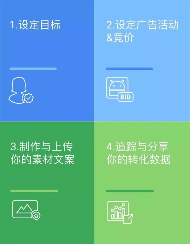 Google 小贴士:第一步的“设定目标”,其实就是开发者自己的KPI,告诉UAC,你想要的用户是怎么样的,想要用户做什么:增加下载量、增加App收入、增加用户留存……这些都可以由你定义。UAC了解目标和预算后,就会在所有它能触及的渠道上发力,为你达成目标。