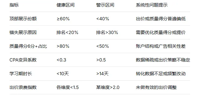 你可以每月制作一份“竞价健康度评分卡”,对照以下标准: