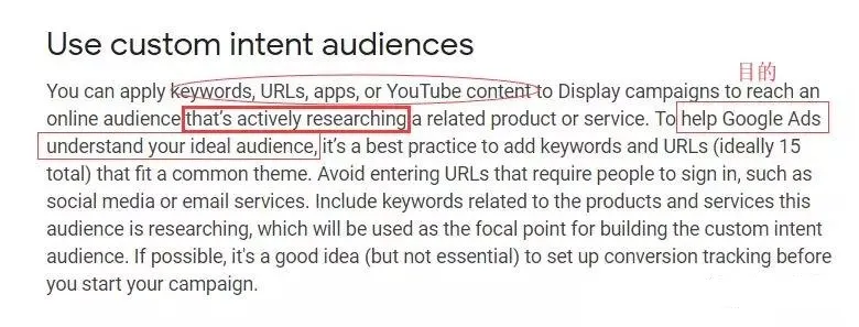 这里的意思就是说,我作为广告投放方,我要采用基于人的定位方式,我要怎么做?我可以告诉谷歌:我的核心受众有啥啥爱好,购买我的产品可能是为了完成什么目标或事项,或者曾经在我网站上逗留但是没有购买。我把这些信息告诉google之后,google就能清楚我的核心受众可能是怎样的人,然后就能把我的广告投给哪些人群。