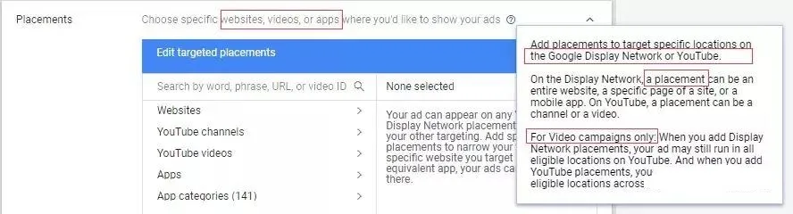 placement这个定位方式直接供我们选择和是的展示位置,包括google 展示广告网络和YouTube,也分移动端和桌面端。