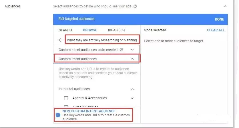 在后台中,对应的页面如下图。首先,我们可以选择自动类型的定位方式,即让谷歌广告系统自动定位到那些对我们产品或服务有需求(动机明显)的人群,其次,可以选择手动自定义——custom intent audience。