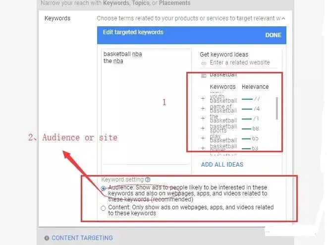 这意味着我可以既让我的广告在和关键词匹配的网页出现,也可以让谷歌直接推送给和这些关键词联系紧密的人群。