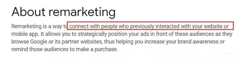 什么是remarking?假设我知道之前访问我的网站的用户的信息,其中一部分用户没有转化或购买我产品或服务,我可以使用再营销定向,让谷歌把广告再次推送给这部分人群进行多次营销。